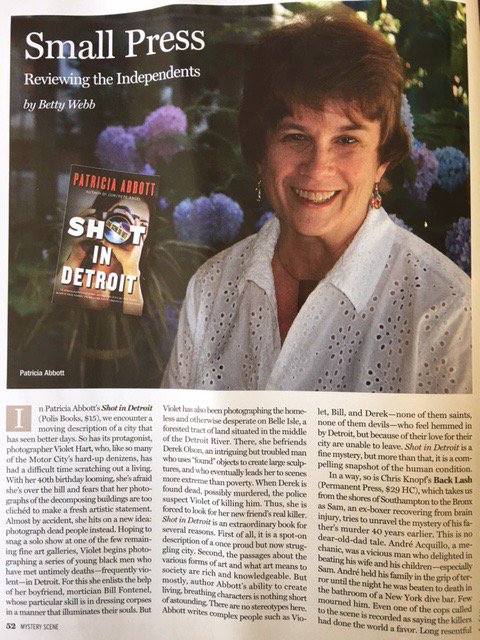 Patricia Abbott is the author of more than 125 stories that have appeared online, in print journals and in various anthologies. She is the author of two print novels CONCRETE ANGEL (2015) and SHOT IN DETROIT (2016)(Polis Books). CONCRETE ANGEL was nominated for an Anthony and Macavity Award in 2016. SHOT IN DETROIT was nominated for an Edgar Award and an Anthony Award in 2017. A collection of her stories I BRING SORROW AND OTHER STORIES OF TRANSGRESSION will appear in 2018.